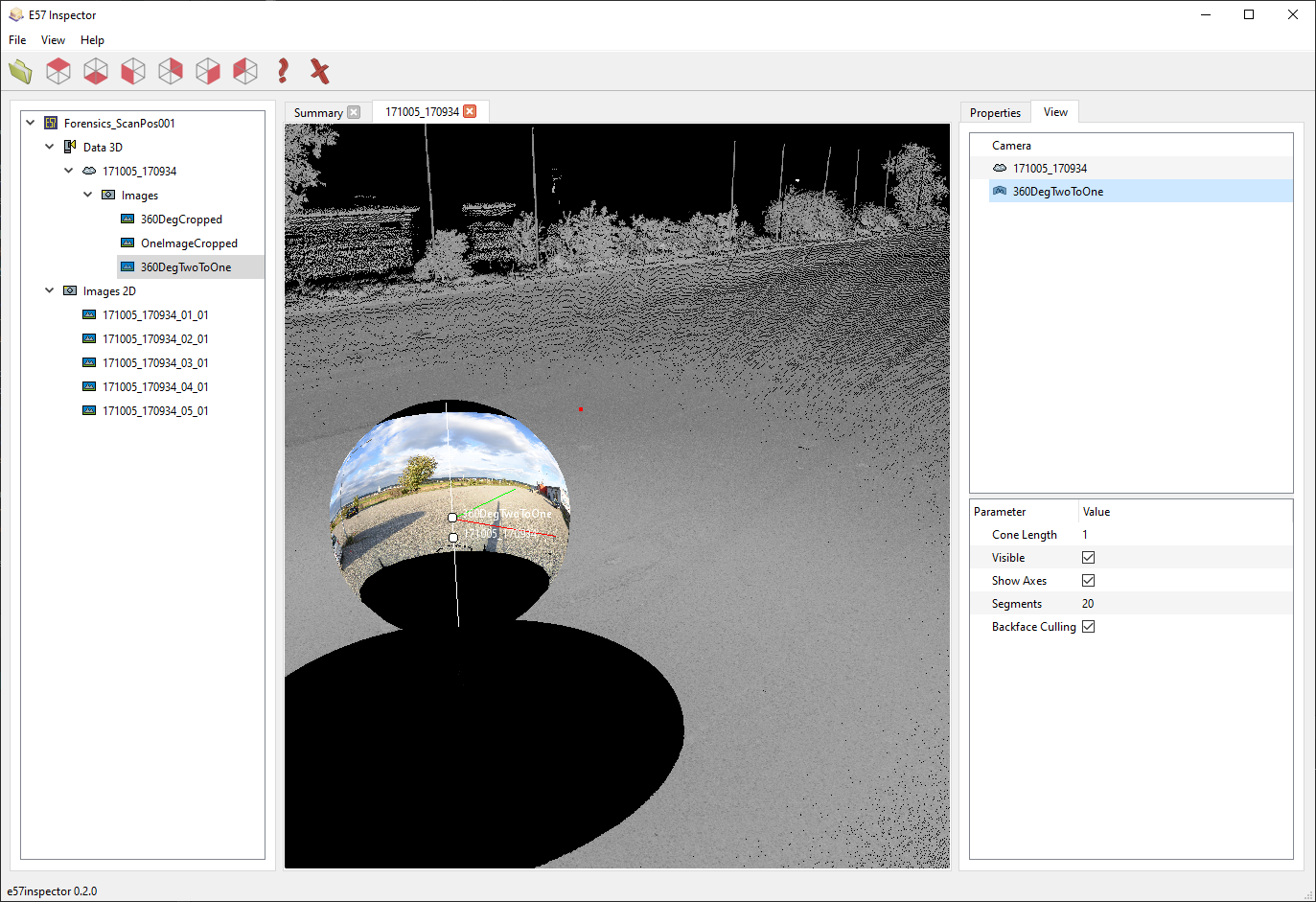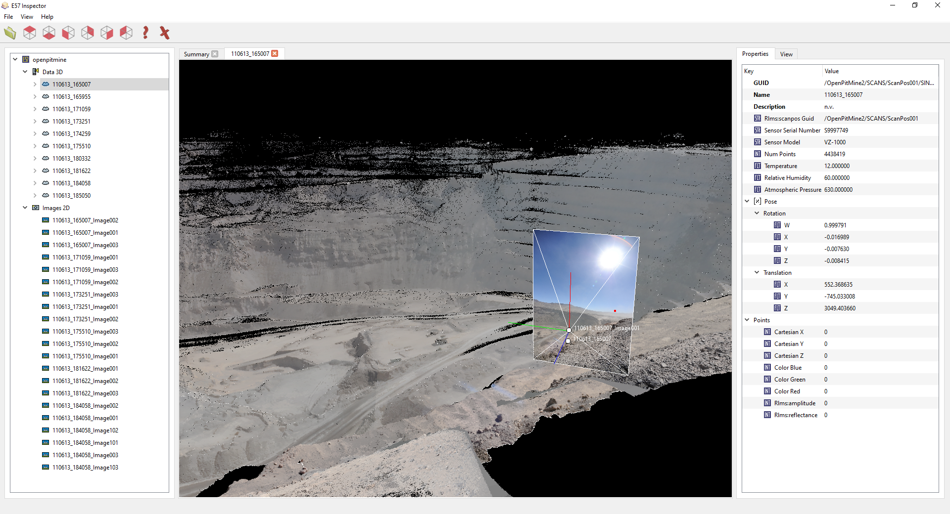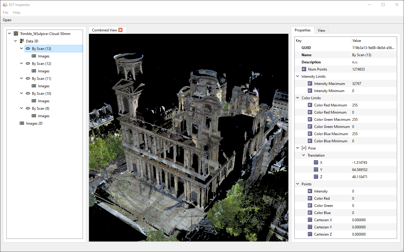 Open the e57 file and view point clouds and images in a tree view. Clicking on the objects reveals their attributes (such as point count, image width, ...) on the right side.